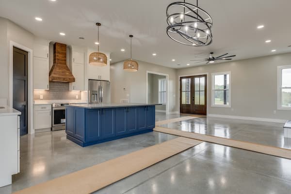 This Bristol, TN home is located in a beautiful 10 acre field. We utilized the popular “barndo” look with this home, but were able to incorporate a full concrete footer as opposed to a “post frame” style build. We were particularly excited about the finished concrete floors and 10’ ceilings and 96” doors on this home.